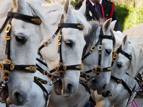 Imagen de cinco caballos de la Policía Nacional en formación, con arneses negros adornados con motivos en color oro.