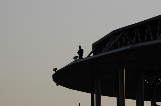 Policía Nacional situado en la terraza de un edificio realizando labores de vigilancia.