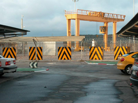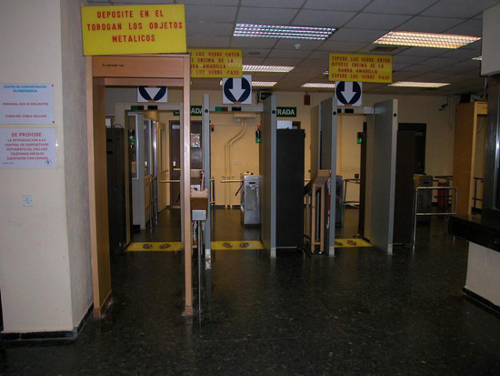 Arcos de detección de metales y tornos a la entrada de un edificio.