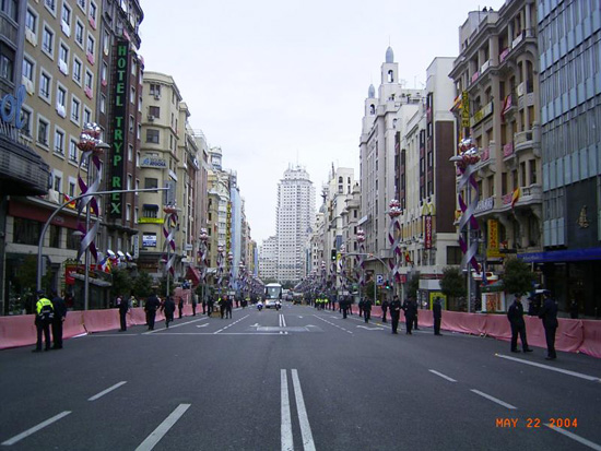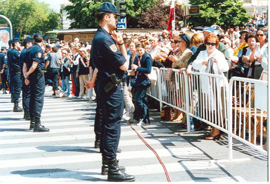 Formación en línea protegiendo desfile delante de la que se encuentra hilera de vallas protectoras. Tras ellas asistentes al mismo y cámaras de TV.