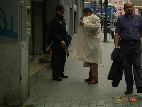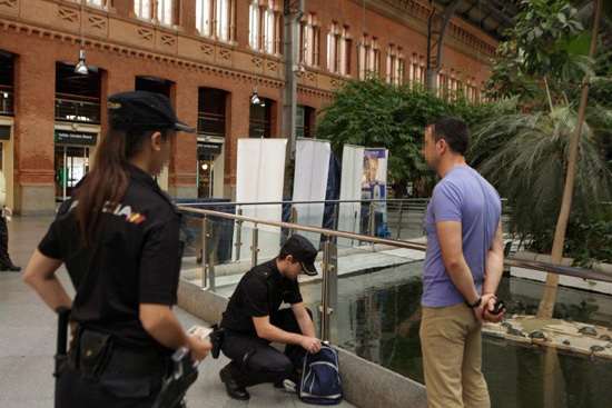 Junto al estanque de la estación de Atocha (Madrid), un policía registra la mochila de un ciudadano mientras una policía lo vigila.