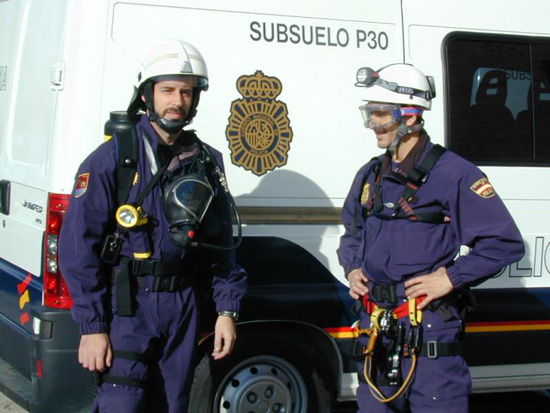 Dos Policías Nacionales de la Unidad de Subsuelo y Protección Ambiental posan equipados con el material de trabajo.