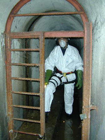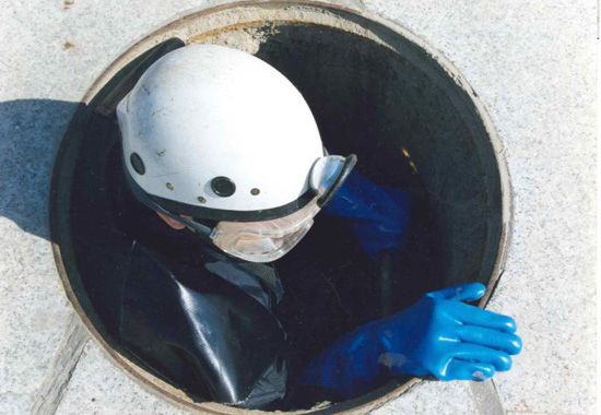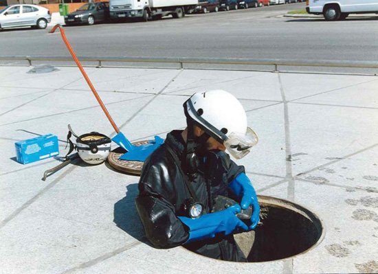 Policía Nacional de la Unidad de Subsuelo y Protección Ambiental equipado con mono de trabajo y casco realizando una inspección de una alcantarilla.