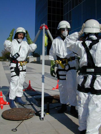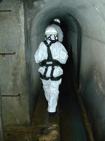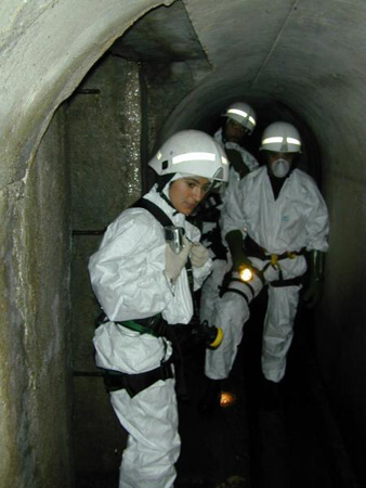 Policías Nacionales de la Unidad de Subsuelo y Protección Ambiental equipados con el traje de protección, casco y mascarilla.