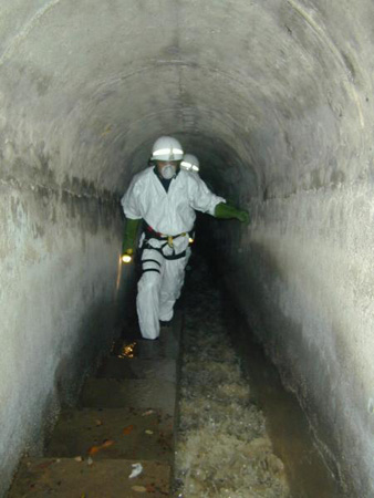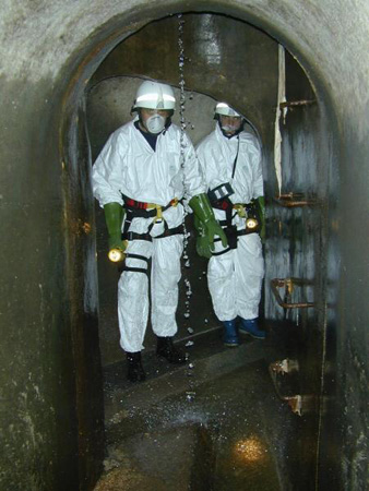 Policía Nacional de la Unidad de Subsuelo y Protección Ambiental equipados con mono de trabajo y casco realizando una inspección de una alcantarilla.
