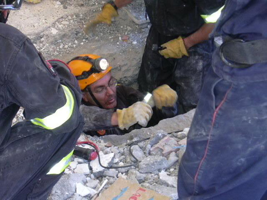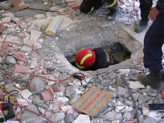 Miembro de un equipo de rescate se introduce en agujero, ayudado por otras personas, alrededor se pueden observar multitud de escombros.