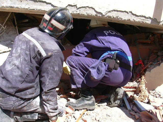 Policía Nacional de la Unidad de Subsuelo y Protección Ambiental, colabora junto con un bombero en el derrumbe de un edificio.