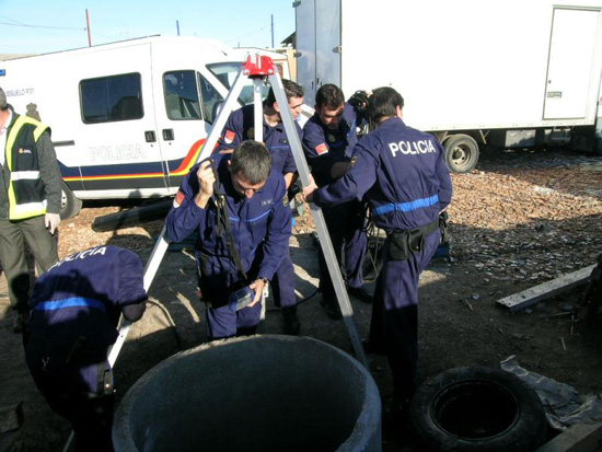 Policías Nacionales de la Unidad de Subsuelo y Protección Ambiental equipados con mono de trabajo montando una pequeña grúa