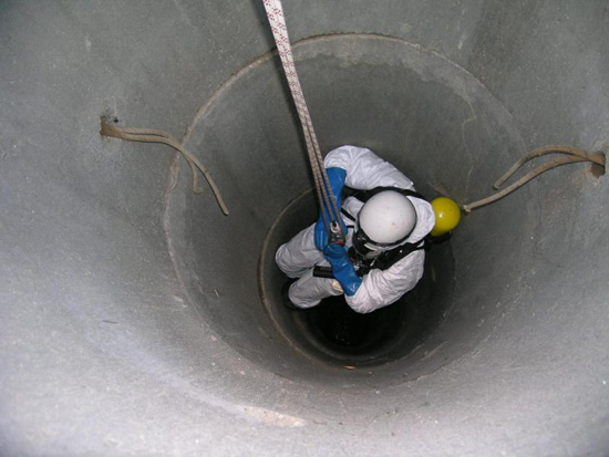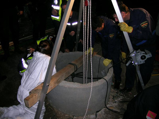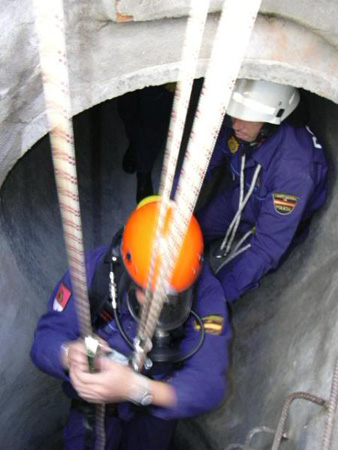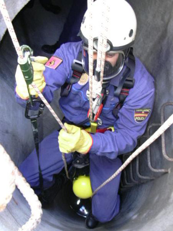 Policía Nacional de la Unidad de Subsuelo y Protección Ambiental equipado con un mono de protección, bajando por un pozo ayudado de una cuerda