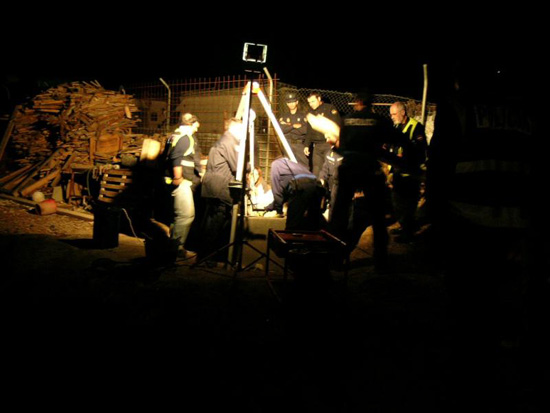Policías Nacionales trabajando en la noche, alrededor de un pozo iluminados por lámpara.