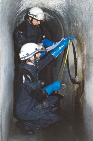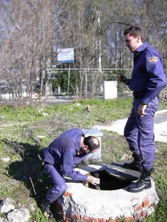 Policías Nacionales de la Unidad de Subsuelo y Protección Ambiental equipados con mono de trabajo inspeccionas la entrada de una alcantarilla