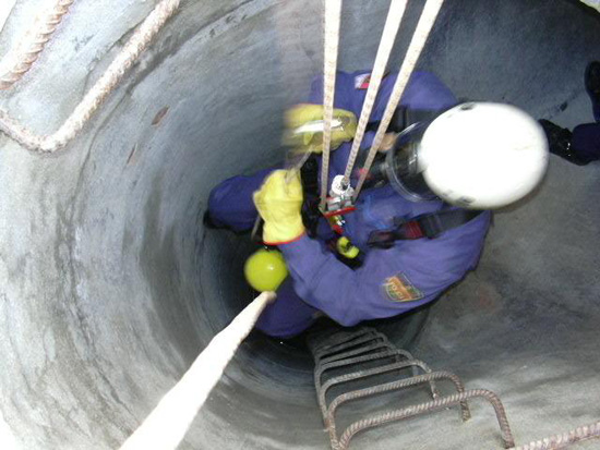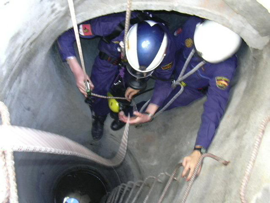 Policías Nacionales de la Unidad de Subsuelo y Protección Ambiental, bajando por un pozo ayudados por una cuerda.