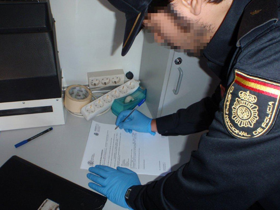Un policía nacional realiza una identificación y un control de metales a un hombre en la vía pública.