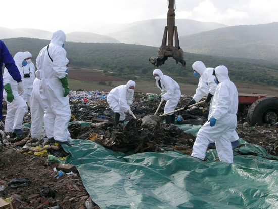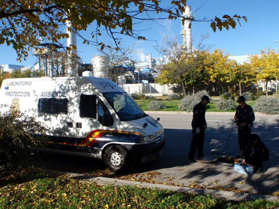 Policía Nacional de la Unidad de Subsuelo y Protección Ambiental equipado con equipo de protección inspeccionando una parte de un vertedero
