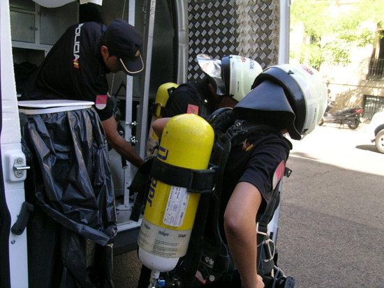 Policía Nacional de la Unidad de Subsuelo y Protección Ambiental se equipa con una botella de aire.
