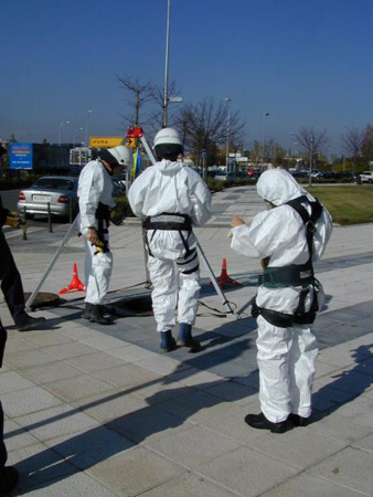 Un Policía Nacional de la Unidad de Subsuelo y Protección Ambiental se equipa con un traje de protección para proceder a sus funciones de seguridada.