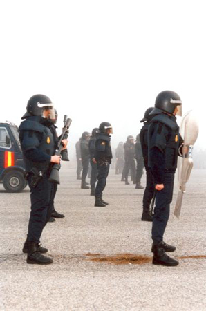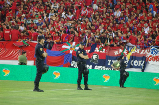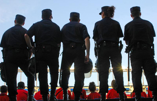 Cinco miembros de la Unidad de Intervención Policial, cuatro hombres y una mujer, vigilando en un estadio durante la celebración de un partido.