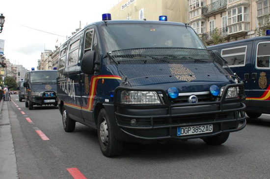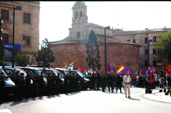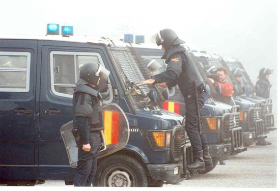 Seis furgonetas y varios policías en formación delante de ellas, vigilando el desarrollo de una manifestación. Se observan banderas republicanas.