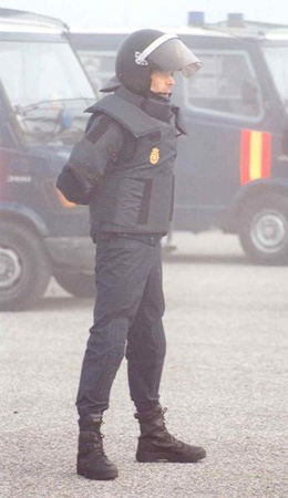 Policía ataviado con el chaleco anti trauma y el casco de protección con la visera bajada, frente a vehículo Nissan Patrol de la Unidad.