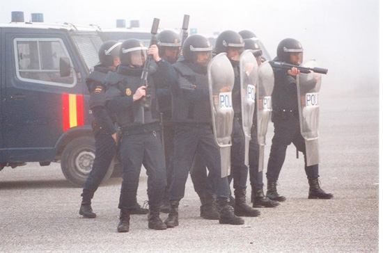 Policías con el material de protección, escudos y cascos, puesto. Están en formación. Primer plano policía con escudo desplegado protegiéndole.