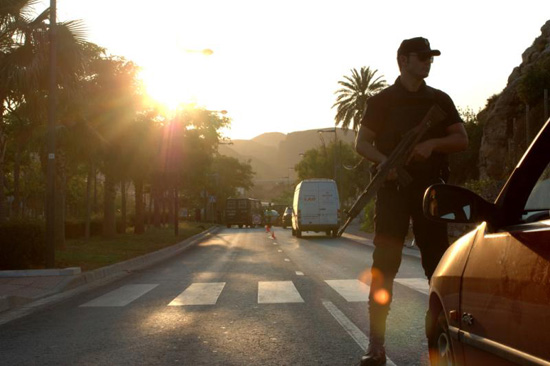 Un policía con arma larga dando el alto a los vehículos. De fondo se observan furgonetas y miembros de la Unidad realizando un control de vehículos.