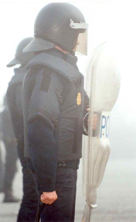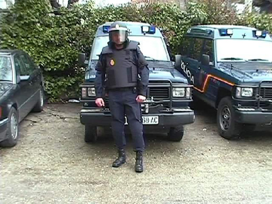 Policía con chaleco y casco puesto, con los brazos a la espalda, frente a dos furgones. Se observa ambiente denso por humo.