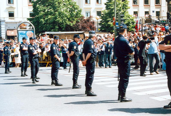 Formación en línea de varios policías protegiendo un desfile. Delante de ellos hilera de vallas protectoras tras las que se encuentran los asistentes.