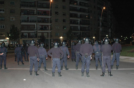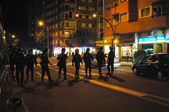 Más de quince policías en formación vigilando el desarrollo de una manifestación. Es de noche. Portan el casco en protección, sobre la cabeza.