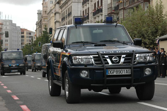Desfile de vehículos de la Unidad de Intervención Policial. Al frente Nissan Pathfinder. De fondo furgonetas en formación.
