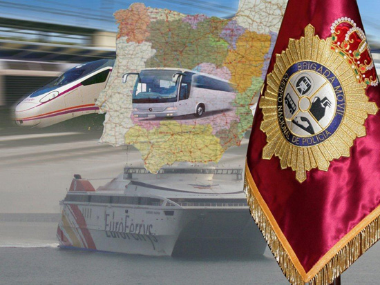 Composición de un mapa de España y fotos de un tren AVE, un autobús y un Ferry, junto con un banderín color carmesí con el escudo de la Brigada Móvil.