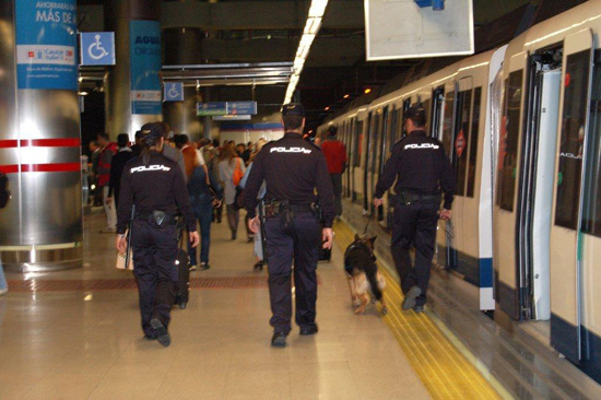 Tres Policías Nacionales patrullan un andén de metro con un perro de la Unidad de Guías Caninos.