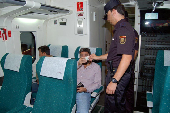Dos policías Nacionales realizan un control de documentación a un ciudadano sentado en el asiento de un tren.