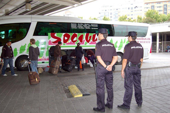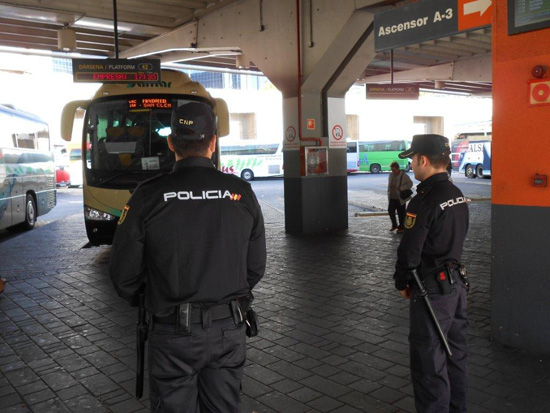 Dos Policías Nacionales vigilan el andén de una estación de autobuses, mientras viajeros introducen sus pertenencias en el maletero de un autobús.