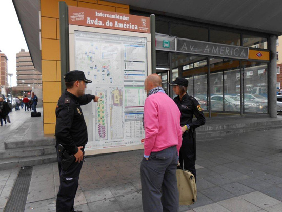 Un policía da indicaciones a un ciudadano frente a un plano del intercambiador de Avenida de América en Madrid, en compañía de una policía.